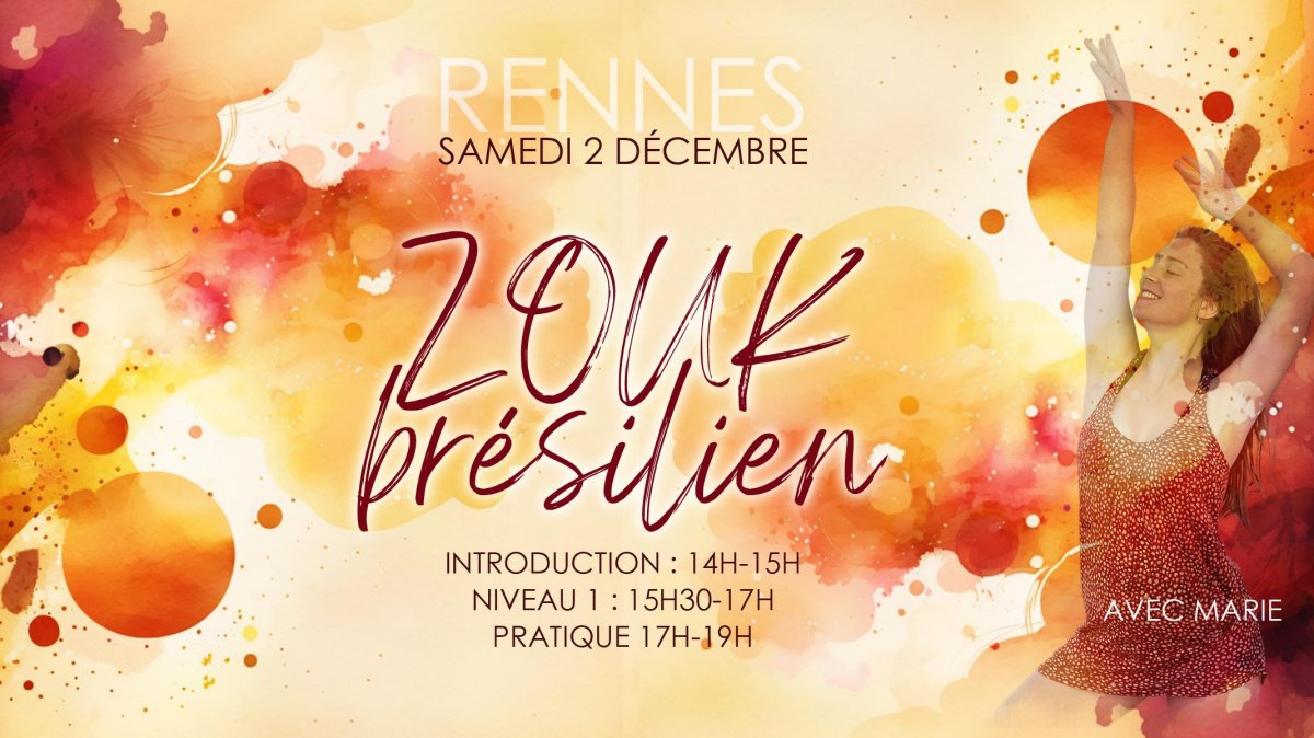 Danseurs, danseuses, le Zouk brésilien revient à Rennes ! Venez partager une après-midi de stage (+2h de pratique libre), à destination des curieux qui n'ont jamais fait de zouk comme de ceux qui ont déjà osé se lancer. Venez (re)découvrir votre créativité, vous immiscer dans un travail technique approfondi et vous offrir un moment d'immersion dans les subtilités et la connexion du zouk brésilien.